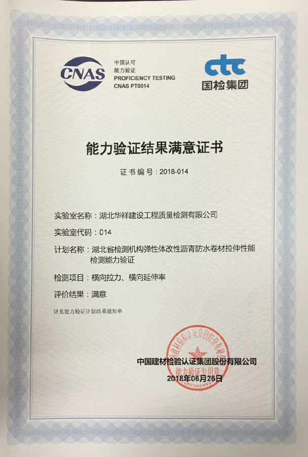 公司参加2018年度“湖北省检测机构弹性体改性沥青防水卷材拉伸性能检测能力验证”,参加防水卷材拉伸与陶瓷砖吸水率两项能力验证,结果均为满意。